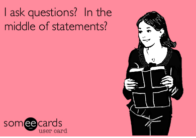“Mummy!! These women sound like idiots!” (She changes her tone to Valley Girl speak) “They speak in, like, questions? Where they, like, SAY things? And they use like as a comma or just as a, like, pause, be – like – cause they don’t have brains? ARGH!!!!”