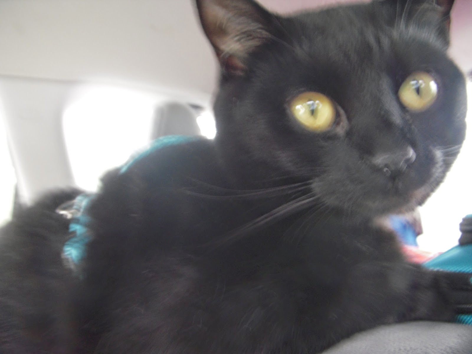 Minuit went mental when we went to live in New York for 6 months.  She had been fine until then.  We’d housed her when she was about 16 weeks, in that gawky, teenager stage of kitten.  She was snuggly and playful and svelte – until we went to New York.  She didn’t seem to mind the trip down.  Her innate curiosity came out.  She didn’t hide.  She sat either on our laps or on the stack of pillows beside Rissa in the backseat…  She chirrupped and purred contentedly.