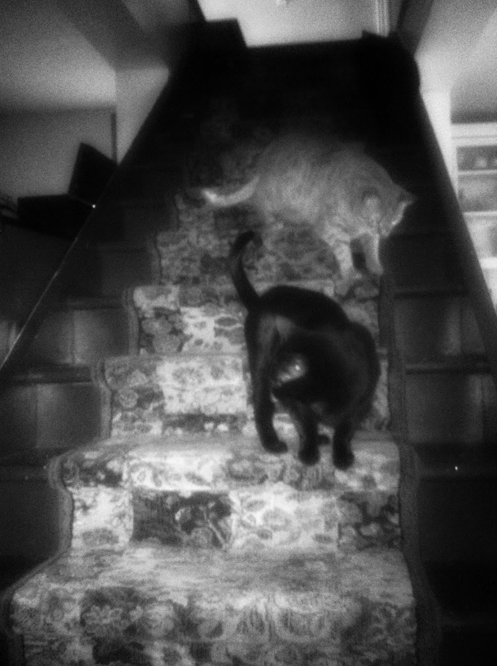 “Cats! EVERYWHERE!!! As far as the eye can see – except the eyes CAN’T see them, at least not in the dark, on this staircase. It’s okay for Steve – he’s an orange tom, but freakin’ Minuit and Lola are black cats! Do you know how difficult it is to see black cats on a staircase in the LESS THAN ADEQUATE LIGHT?!?“
